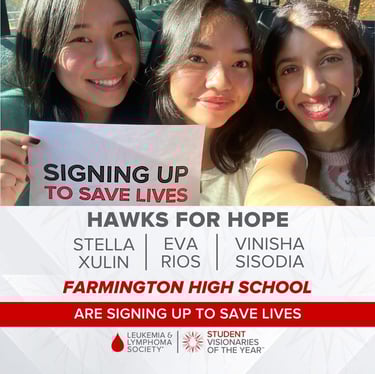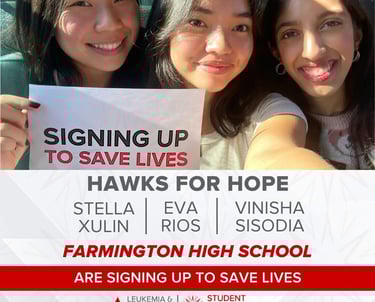 I am the co-president of Farmington High School's Student Vision Cancer Society (Team Hawks for Hope) 2023 & 2024. Working with my team, I spearheaded sponsorship and fundraising efforts to raise over $16,000 for the Leukemia Lymphoma Society, benefiting blood cancer patient care. We managed this by sharing our our personal stories with cancer, hoping it would touch those who have been likewise affected. Not only did it earn us support in our community, we gained sponsorships by local businesses as a result as well. During this truly inspiring experience, I found my love for advocacy and sharing real stories.